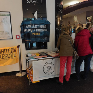 Am 07. November haben wir zusammen mit den Omas gegen Rechts Hildesheim den Film "Kein Land für Niemand" aufgeführt. Die Filmemacher Maik Lüdemann und Max Ahrens sowie Neeske Beckmann von Sea Watch waren vor Ort und haben im Anschluss an die Vorführung mit den Zuschauer*innen erzählt, diskutiert und Fragen beantwortet. Im Foyer konnten sich die Gäste mit Infomaterial eindecken.